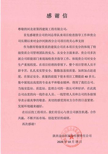 业主单位陕西金沙河面业有限责任公司在感谢信中,对公司管理团队的专业水平和综合实力给予了充分肯定,表达了今后与公司深化合作的意愿。来自不同单位的锦旗上,分别写着“服务至上 诚信履约”“创精品工程 展铁军风采”“技术创新 高质高量”,充分体现了对公司管理团队诚信守责、真抓实干、技术过硬、能打胜仗工作作风的一致肯定。
