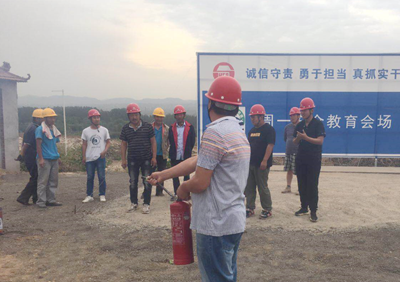 项目部即将进行垫层混凝土浇筑施工,现场有大量的木模板、油漆等易燃品,正值高温季节,火灾隐患较大。项目部结合现场实际组织了本次消防演练,演练分为消防知识培训和火灾事故演练两部分。演练前项目经理李宏伟通报了温岭槽罐车爆炸事故造成的严重后果,阐明本次演练的目的和意义。随后项目部安全员王东春对灭火常识、火灾逃生方法、灭火器如何使用等进行了讲解,并演示了手提式干粉灭火器的具体使用方法,参与演练的人员亲自体验了灭火器的使用。