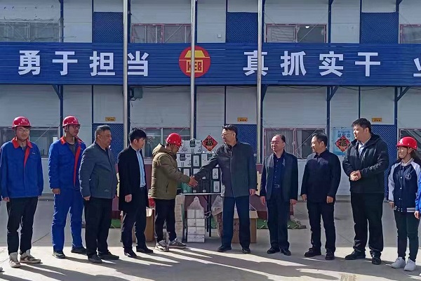 在会议室,唐志强听取了项目基本情况汇报,详细了解职工生产生活、劳动防护等方面情况随后深入施工现场,查看职工工作环境并与职工交流,倾听一线职工声音。C型料场正在进行挡墙主体施工,他叮嘱现场管理人员高度注意安全,防止高空坠落来到项目办公区,院内墙壁上“诚信守责勇于担当真抓实干业绩服人”的工作总要求显得格外醒目“大家远离家乡,在一线兢兢业业,工作辛苦了,我代表公司工会来看望你们……”他向每位职工送上保温杯、牛奶等慰问品,“内蒙古风沙大,最近天气冷,大家一定要注意保暖……”他和职工一一握手问好,并送上殷切关怀