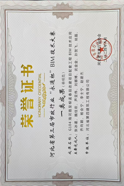 8月16日,七分公司收到了河北省市政行业协会颁发的荣誉证书。分公司参赛的“G104海河路至柳孟春段改建项目配套工程BIM技术应用”成果,在河北省第三届市政行业“永通杯”BIM应用技能大赛中被评为一类成果。