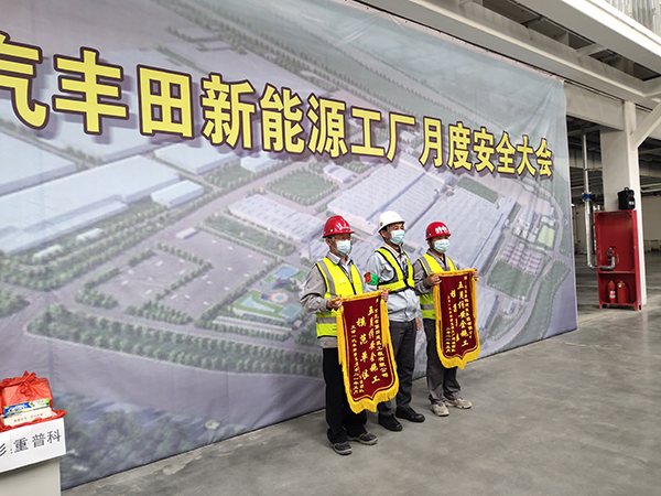 会上,业主对所有参建单位自开工以来的安全管理情况进行了总结,对两家先进集体和两名先进个人进行了表彰。天津一汽树脂车间项目部由于规范严谨的管理,在众多施工单位中脱颖而出,荣获“五月份安全施工模范单位”锦旗;项目安全员王喜峰荣获“优秀安全员”荣誉称号。日方课长督查佐藤和一汽丰田汽车总部副总经理相马清亲对天津一汽新能源工厂项目部安全工作给予了表彰,项目经理苗建伟在会上做交流发言,介绍了项目施工安全管理经验。